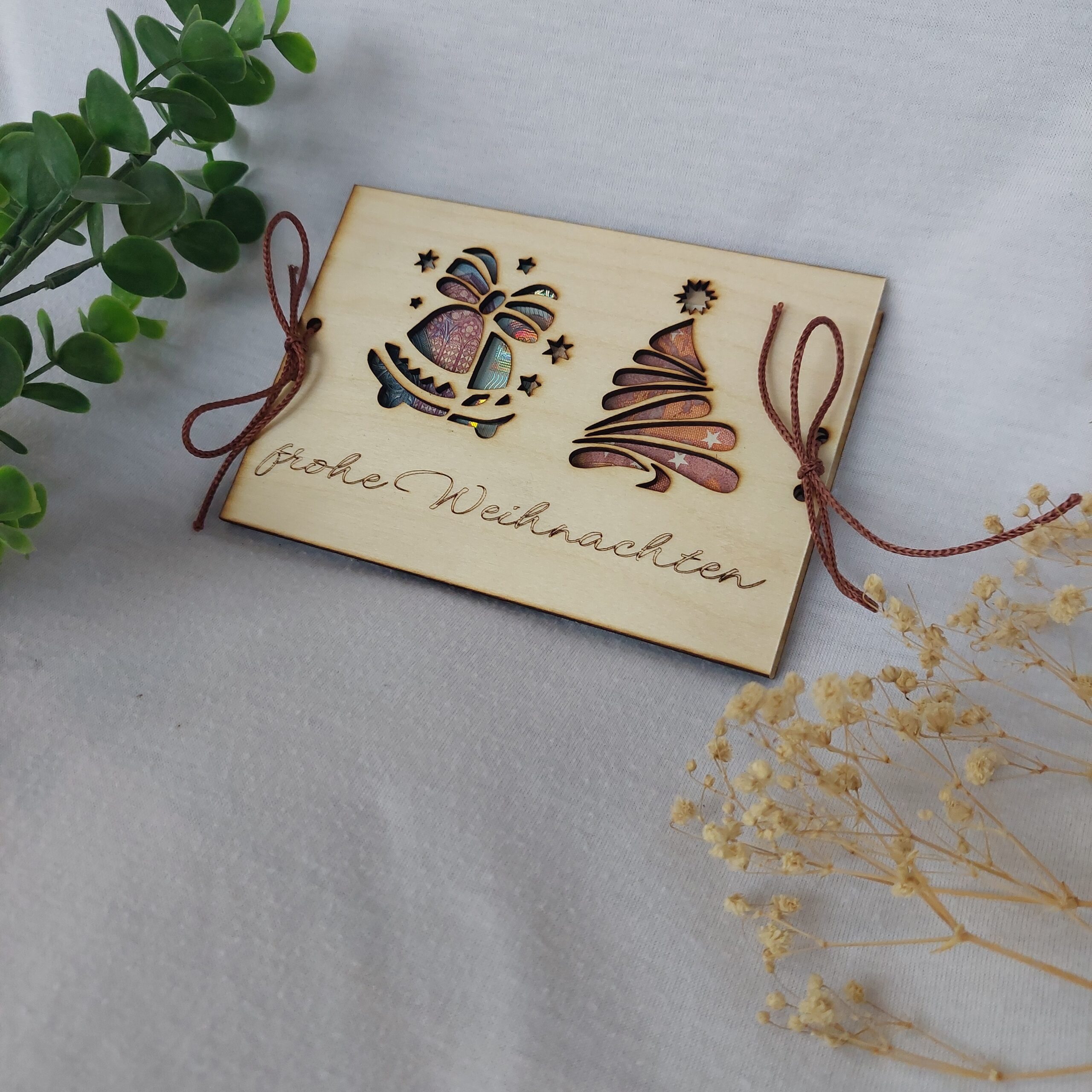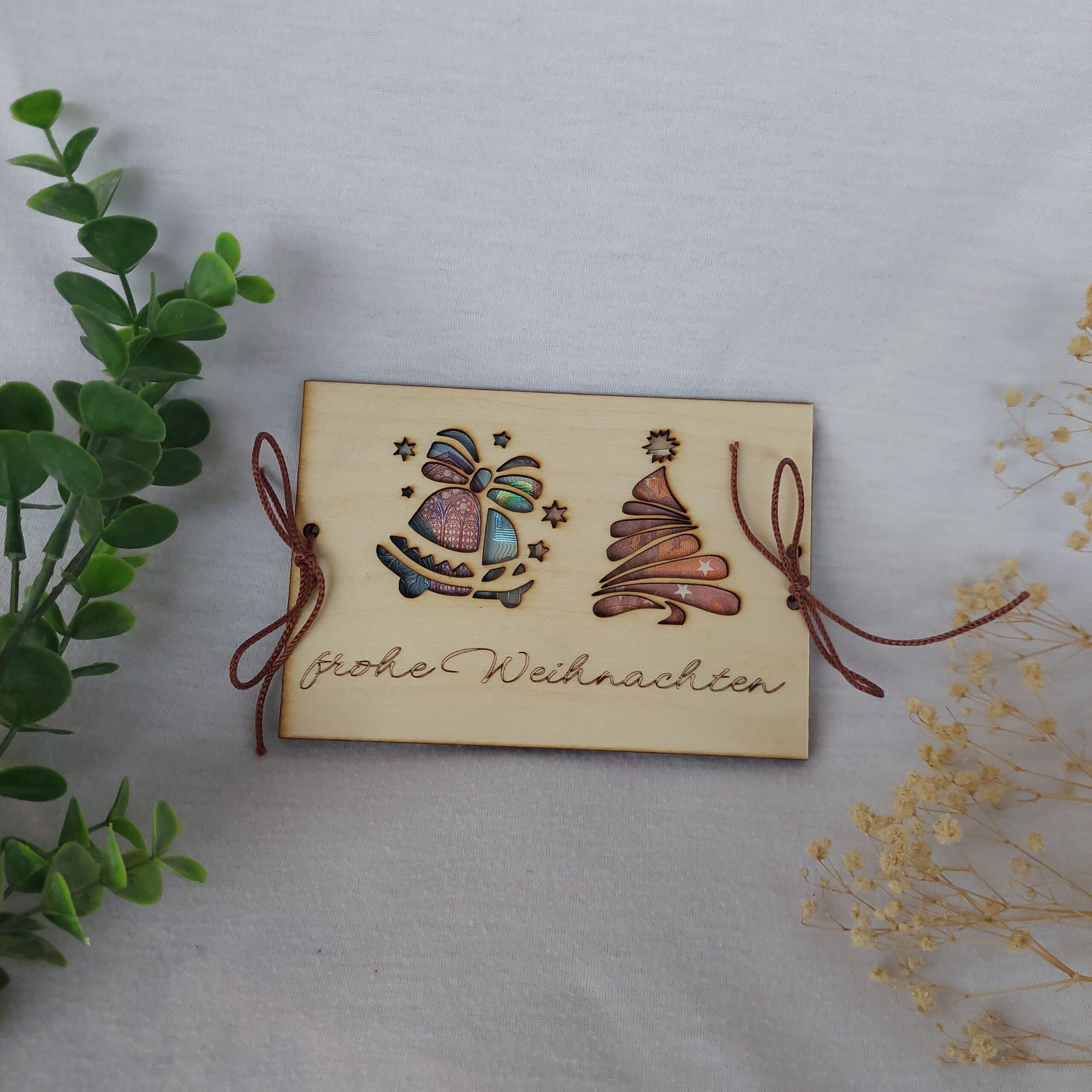 • Festliche Gravur: Die Vorderseite trägt den klassischen Schriftzug „frohe Weihnachten“. Die weihnachtlichen Motive, eine Glocke und ein stilisierter Christbaum, sind filigran ausgeschnitten und farbig hinterlegt (oder schimmern durch das Holz), was einen tollen, festlichen Effekt erzeugt.