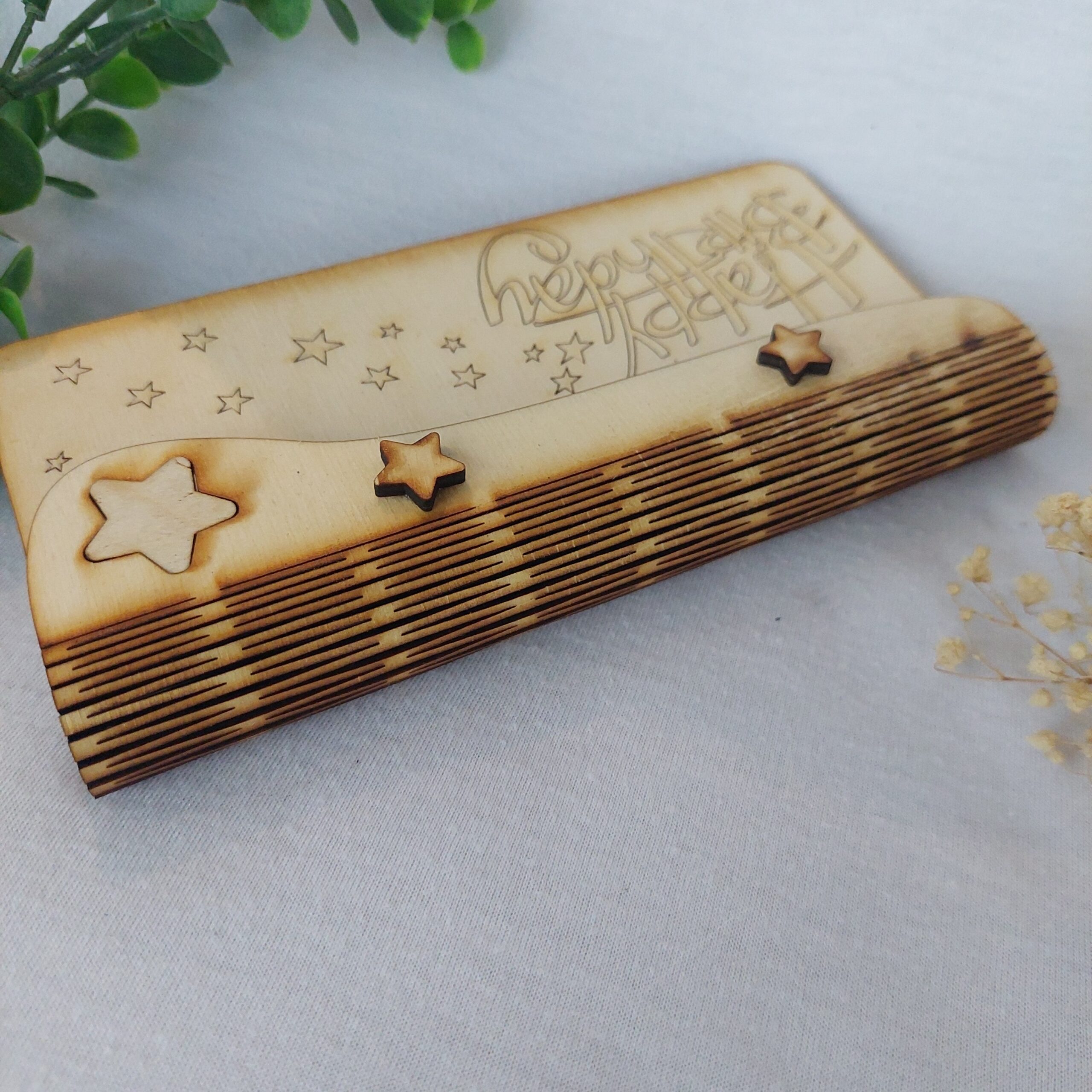 Einzigartiger Geldumschlag aus Holz mit „Happy Birthday“-Gravur und Sternen. Die stilvolle & nachhaltige Alternative zum Gutschein-Umschlag aus Papier.