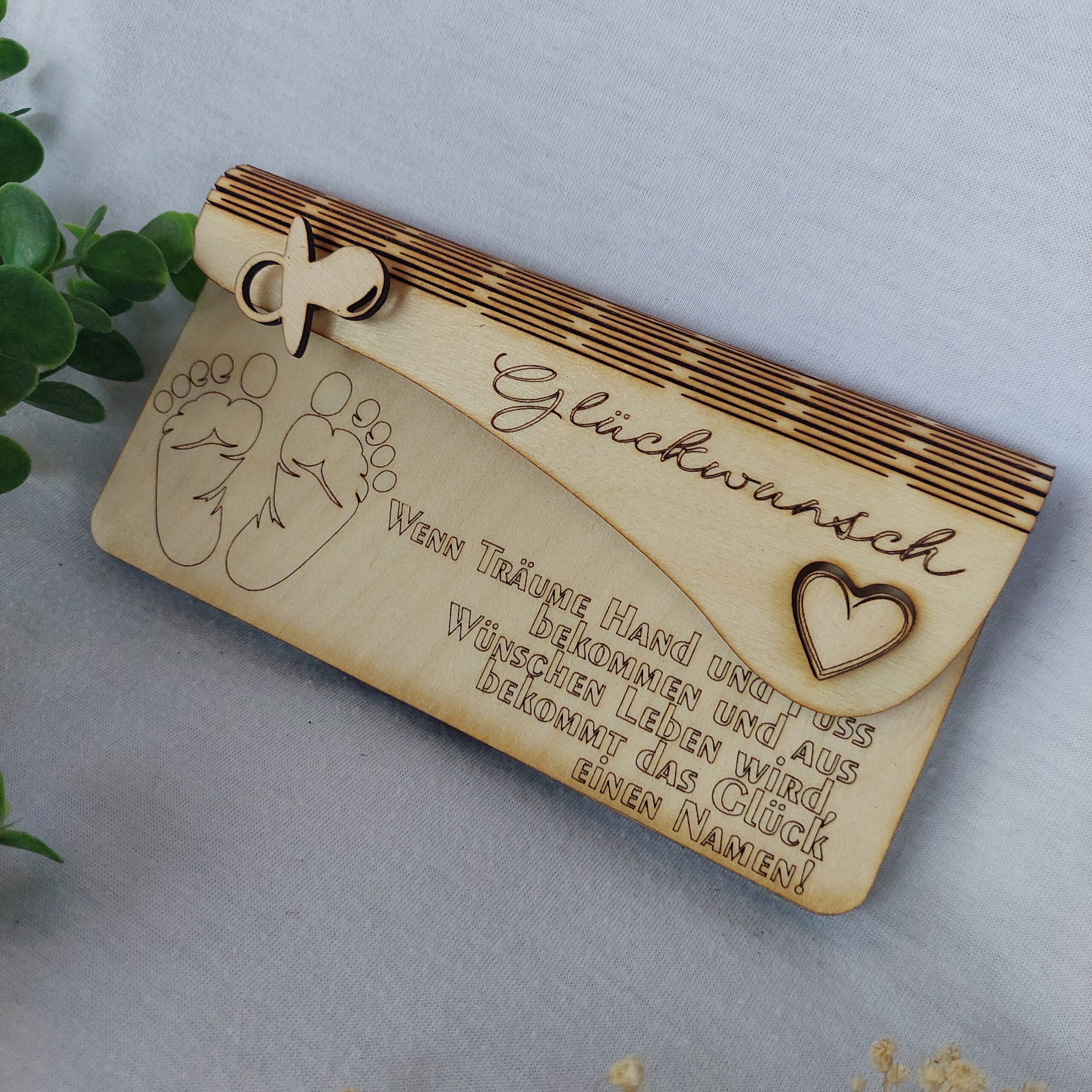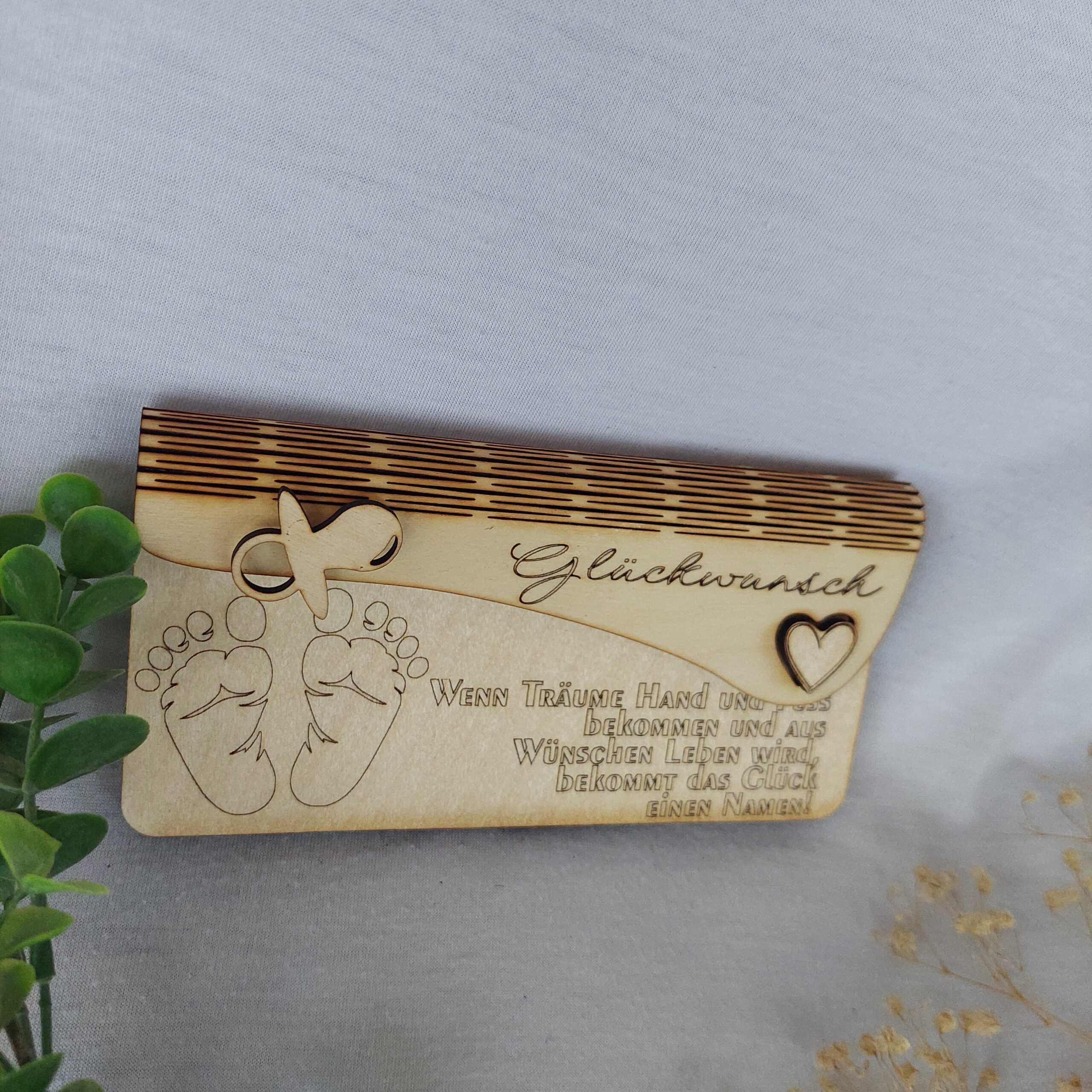 Hölzerner Geldumschlag zur Geburt – „Glückwunsch“ – Originelle Geschenkverpackung