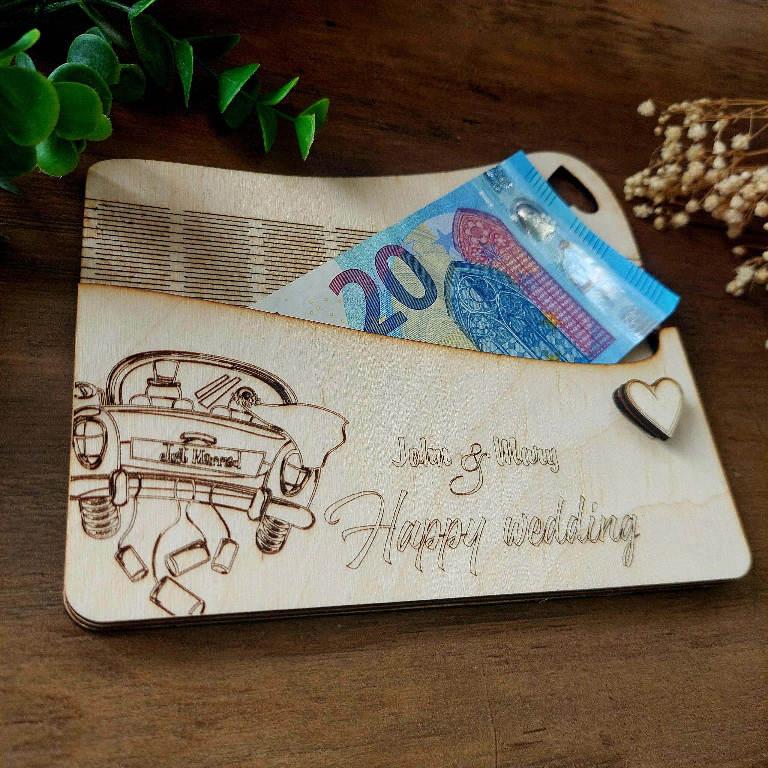 Exklusiver Geldgeschenk-Umschlag aus Holz für die Hochzeit. Individuell graviert mit Hochzeitsauto-Motiv. Das perfekte und stilvolle Geschenk für das Brautpaar.